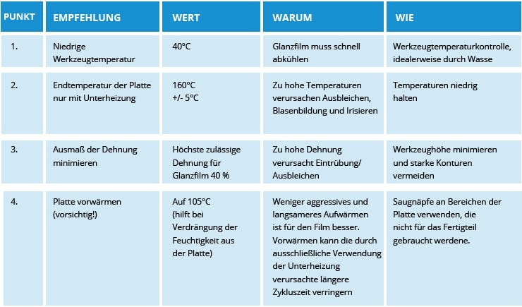 Weitere Informationen zum Glanzfilmprodukt entnehmen Sie bitte dem Soliant-Produktdatenblatt (005) und der Verarbeitungsanleitung (Rev. 20.08.02), um mehr über die Eigenschaften des Glanzfilms und das Umformen der mit Glanzfilm laminierten Platte zu erfahren.